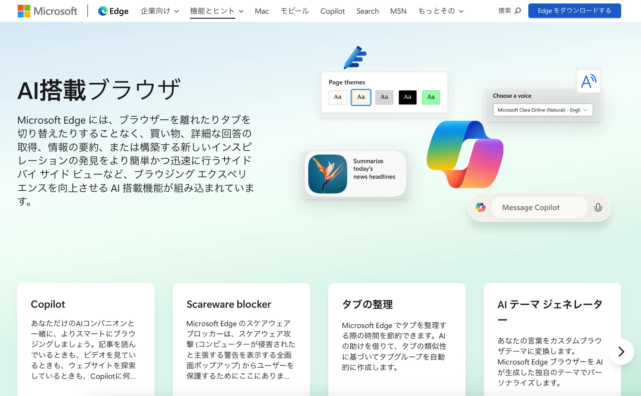 Microsoft Edgeは、企業環境での導入に適したセキュリティ機能と、既存のMicrosoftエコシステムとの高い親和性を備えたAIブラウザです。AIアシスタント機能「Copilot」がブラウザに統合されており、閲覧中のページの要約や業務支援をサイドバーからすぐに実行できます。