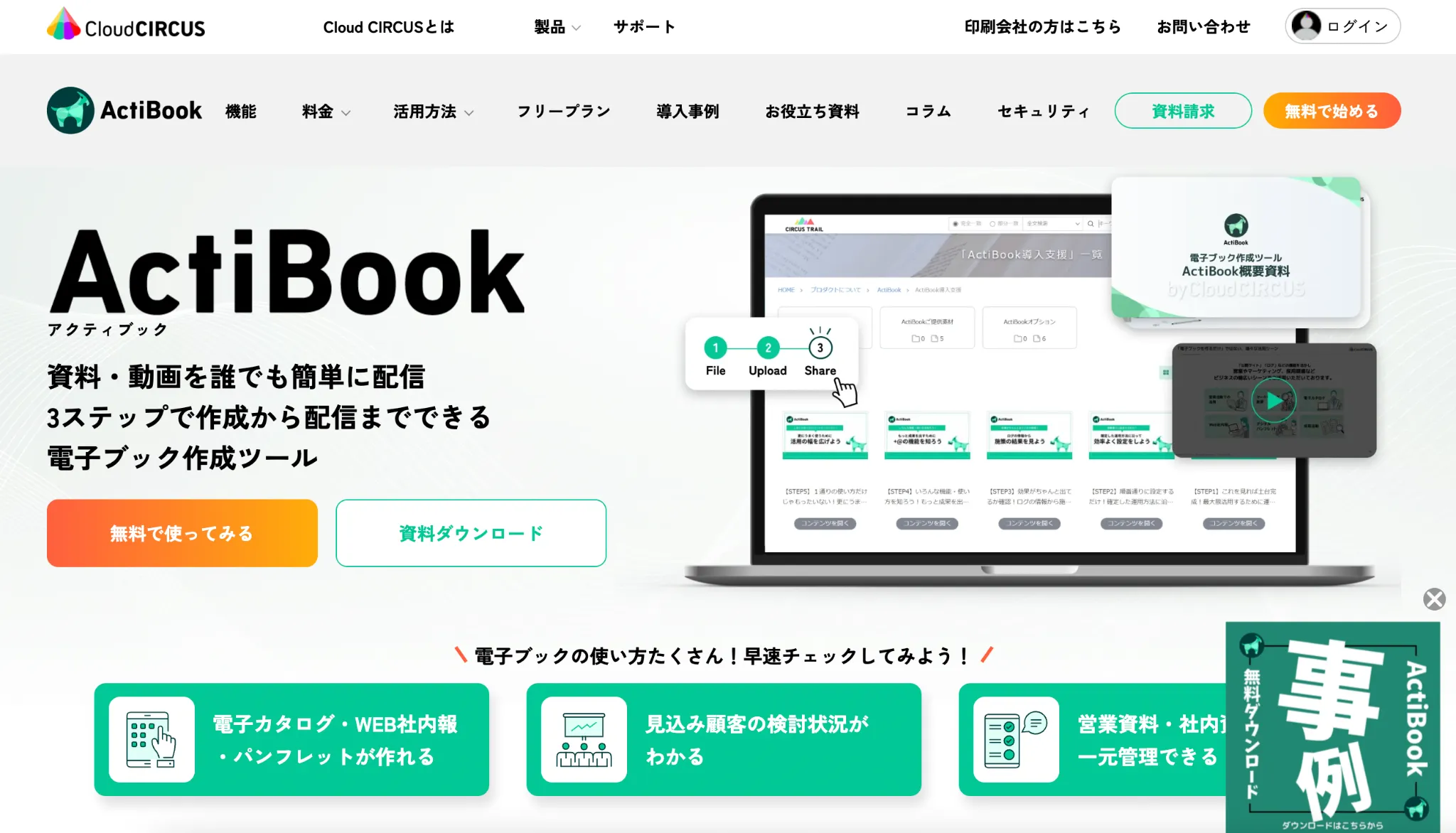 ActiBookは、PDFやOfficeファイルをアップロードするだけで手軽に電子ブック化できるツールです。動画にも対応しており、マニュアルや手順書、社内規程などをデジタル化して配布できます。アクセス制限をかけて社員限定の資料サイトを構築したり、閲覧ログを分析して利用状況を把握できる点も特徴です。