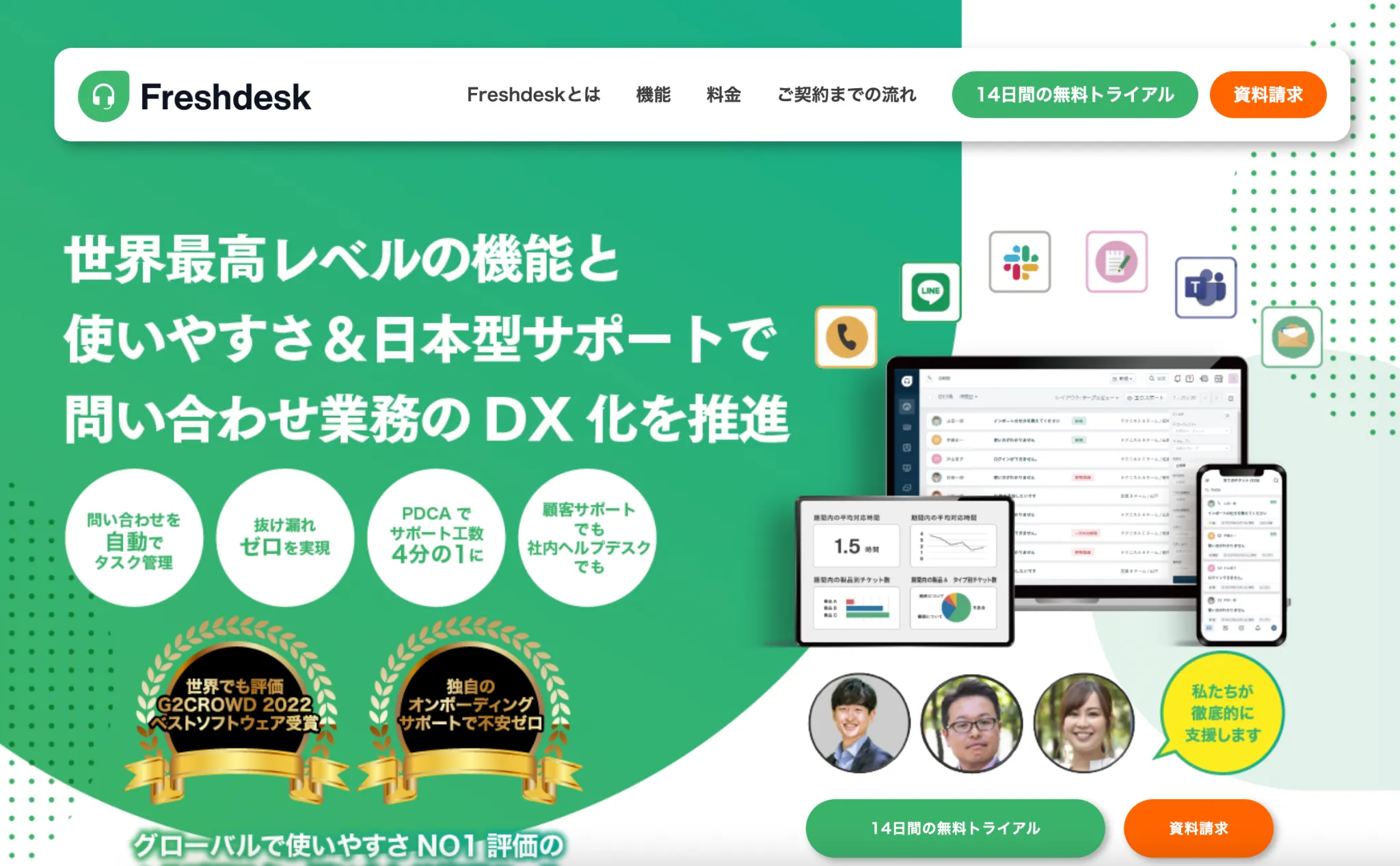 Freshdesk(フレッシュデスク) | ヘルプデスク・カスタマーサポート業務の効率化を支援するデジタルツール。 | マルチチャネルでの一元管理案件の自動振り分けチャットボット・FAQ作成可能運用データ分析 |
