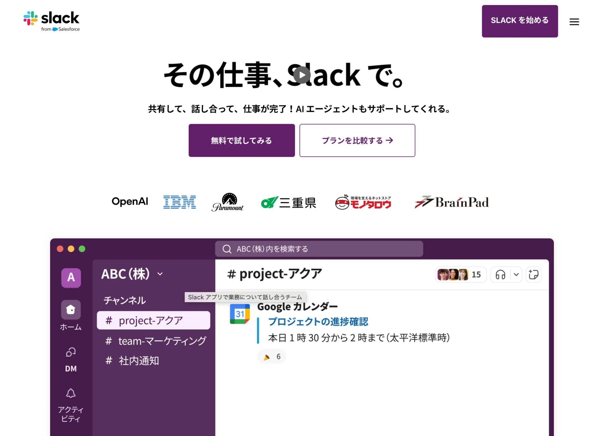 Slackは、日常のコミュニケーションと情報共有を一元化できるチャットツールです。チャンネルごとに会話を整理できるため、過去のやり取りや添付ファイルを簡単に振り返ることができ、ナレッジの蓄積にも役立ちます。